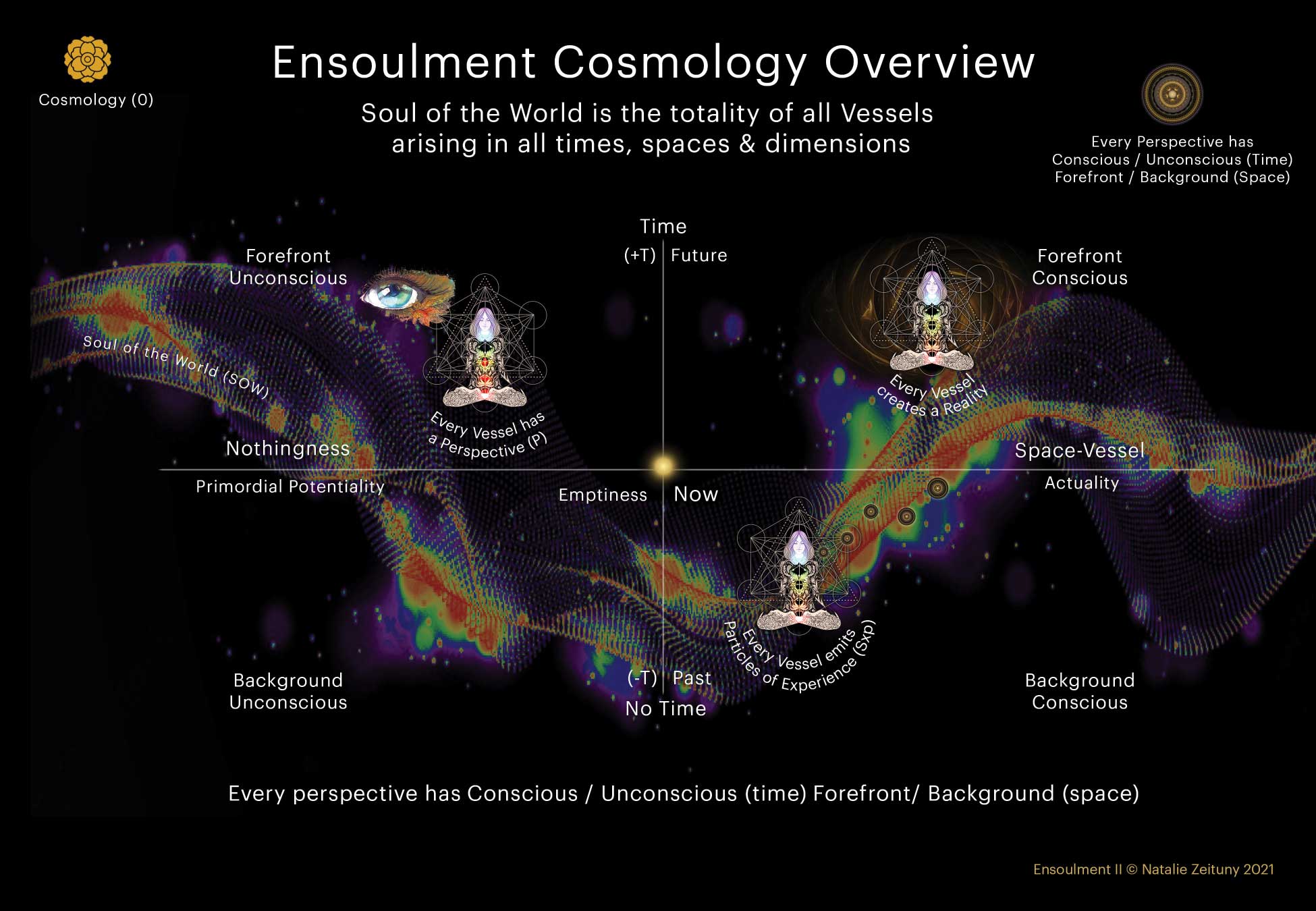 In the center of the diagram, a vessel exists in the full-empty-timeless -nowness. Vessel cannot grasp its nowness because it's the zero point infinitesimal /infinite, still/ fast moving inside the soul of the world. Only the primordial can grasp the soul of the world zero point now. Time and space are essences that inform the vessel orientation in relations to the soul of the world movement and the primordial all that is. A vessel is located in time and space and all its experiences happen within the soul of the world four quadrants. Vessel's experiences are either in the (1) forefront conscious, arising in the now of the vessel and the vessel is actively having an experience and is aware of its content. (2) background conscious experiences belong to the past of the vessel, the vessel is aware of what happened and can recall the content of such experiences (3) forefront unconscious experiences arise in the now of the vessel, when the vessel is actively having an experience and is unaware of its content, it has not yet developed sensory tools to recollect, articulate or express such details of its experience, this is why they are in the current forefront of the vessel perception of here and now, yet, unconscious. After a vessel had an experience, such experiences moves to its past without being aware of such experiences and they move to the (4) background unconscious, in relations to the vessel's now.