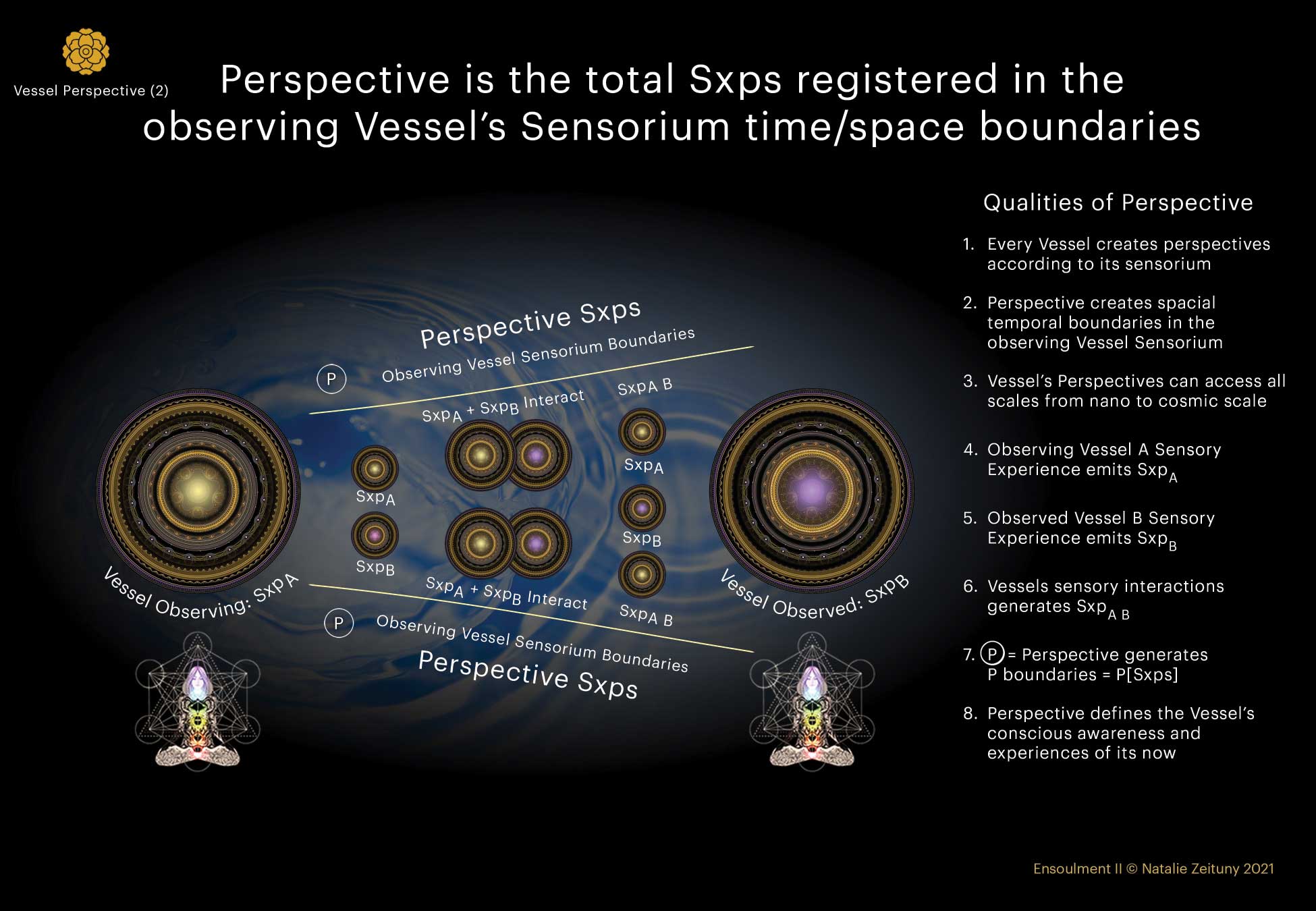 In order for vessels to manage the incoming stream of sensory stimulation that is flooding them in every moment, they create a perspective that makes their experiences and their realities more manageable and more digestible one moment at a time. When a vessel develops its perspective, its way to experience its reality, it narrows down its conscious and unconscious, forefront and background awareness to a limited segment of flow of sxp experiences. Perspective tunnels the vessel's boundaries to register only particular impressions of its environment and as such particular experience of its reality. For example, when vessel A is having an experience (emitting sxpA) observing vessel B emitting (sxpB), that very act of observation creates an observing vessel sensorium boundaries and the observing and observed vessel interact to form a perspective. Every vessel creates a perspective, based on its developmental sensorium, such perspective creates a spacial/temporal boundaries of experience for both the observing and observes vessel, such perspectives are created at all scales of the observing and observed vessel.